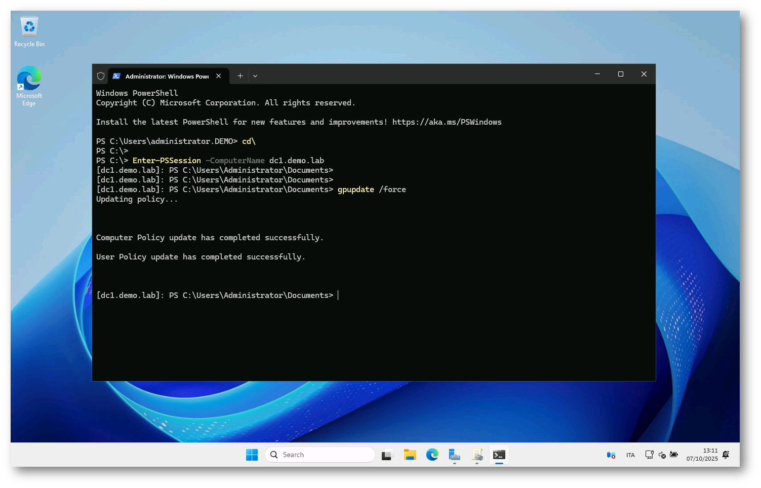 Io ho provveduto a distribuire la policy sul mio domain controller DC1 utilizzando il comando gpupdate /force