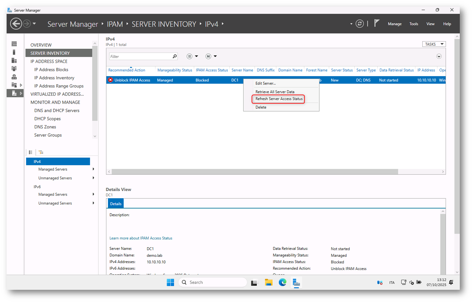 Dopo aver aggiornato le Group Policy IPAM sui server gestiti, occorre aggiornare lo stato di accesso dal lato del server IPAM. Facendo clic con il tasto destro sul server e selezionando Refresh Server Access Status, si forza IPAM a verificare nuovamente la connettività e i permessi. Una volta completata la verifica, lo stato di accesso passa a Unblocked, consentendo la gestione remota e la raccolta dei dati da parte del sistema IPAM.
