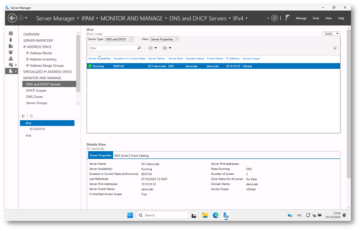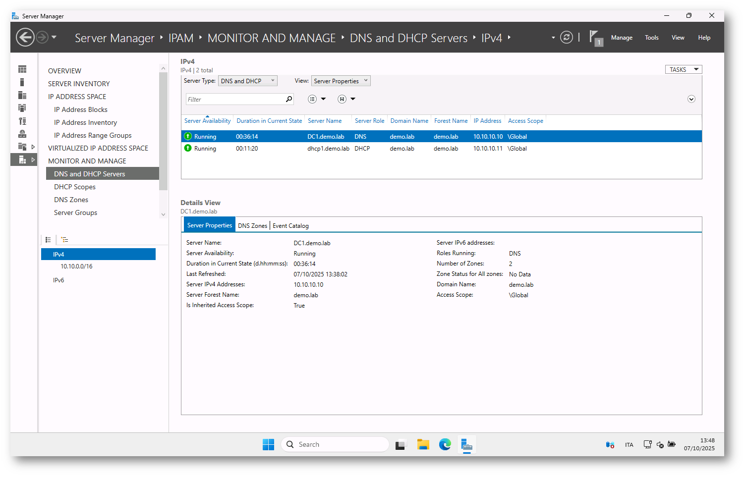 La console di IPAM rappresenta quindi uno strumento completo di monitoraggio e controllo, che permette di verificare in tempo reale lo stato dei server e dei servizi DNS e DHCP, identificando rapidamente eventuali anomalie.