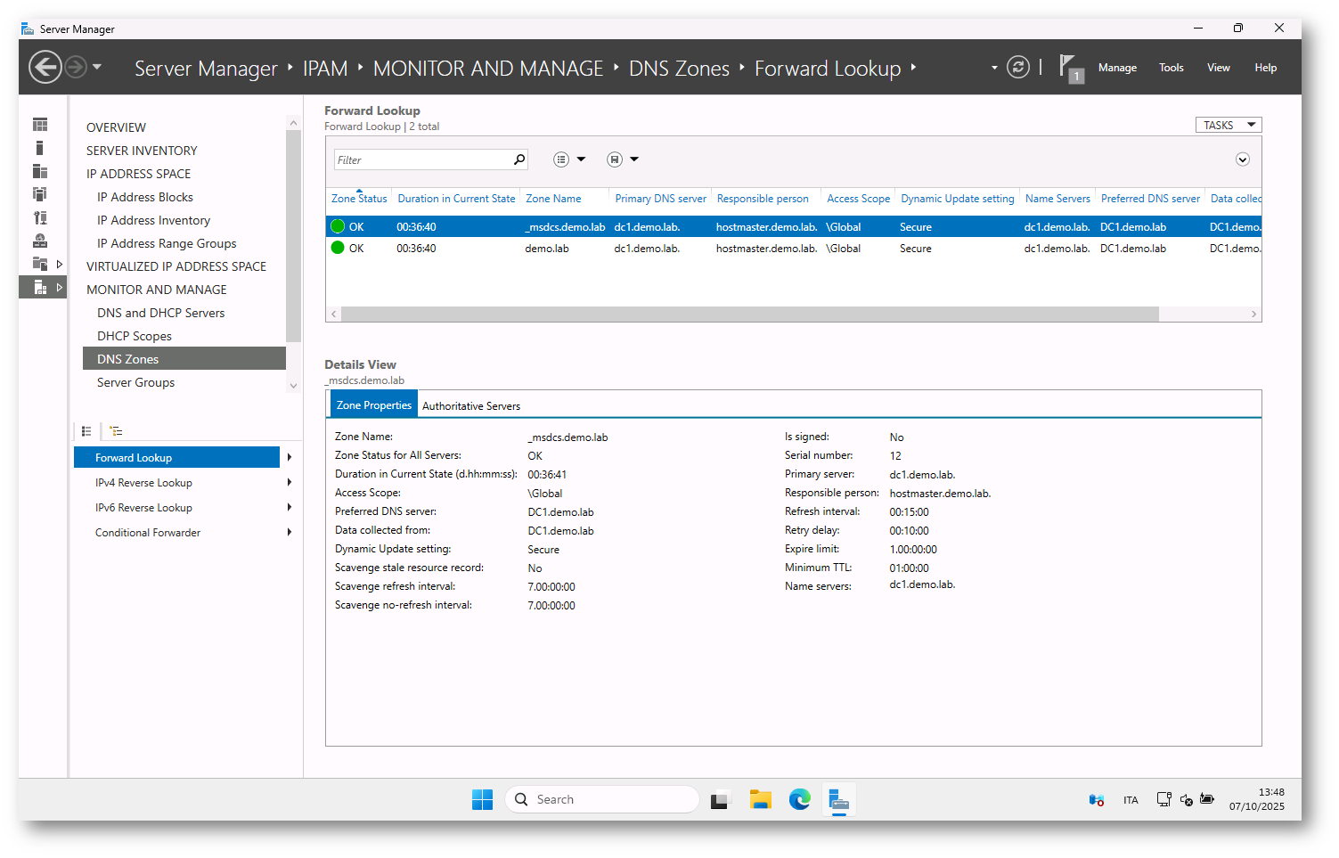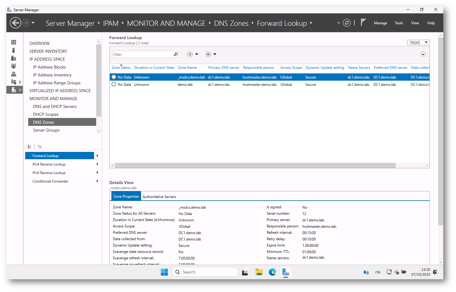 Attraverso la sezione DNS Zones di IPAM è possibile visualizzare tutte le zone DNS rilevate nei server gestiti. La vista Forward Lookup mostra le zone primarie del dominio e fornisce informazioni dettagliate sui parametri di configurazione DNS, sugli aggiornamenti dinamici e sui server autoritativi.