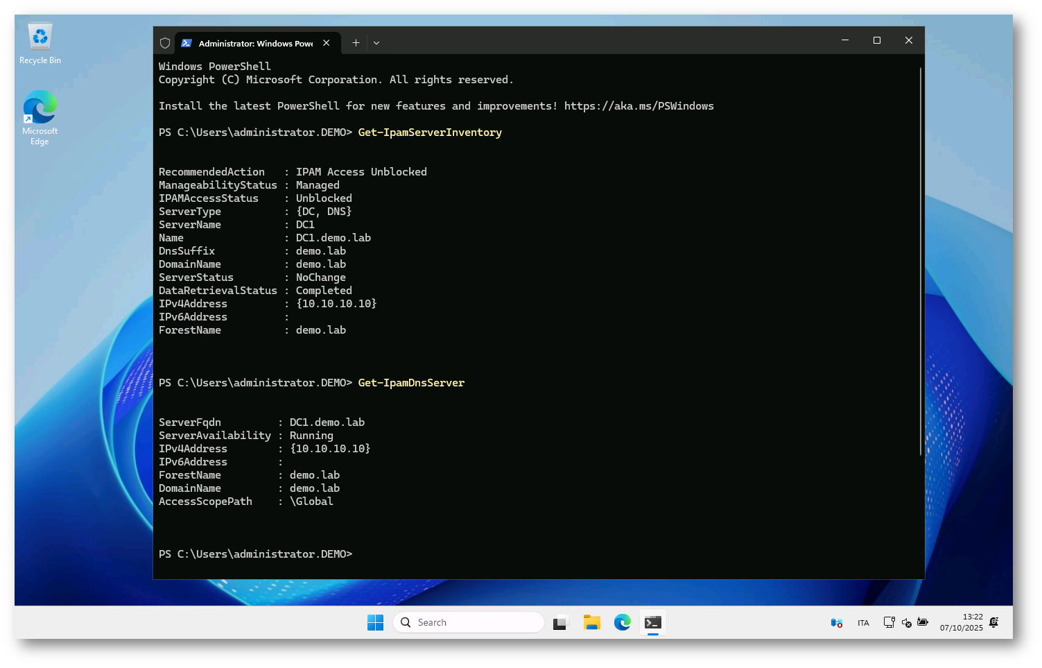 • Automazione via PowerShell (IpamServer module): provisioning, discovery, inventory, gestione degli address space (blocchi, subnets, ranges) e funzioni come Find-IpamFreeAddress.
