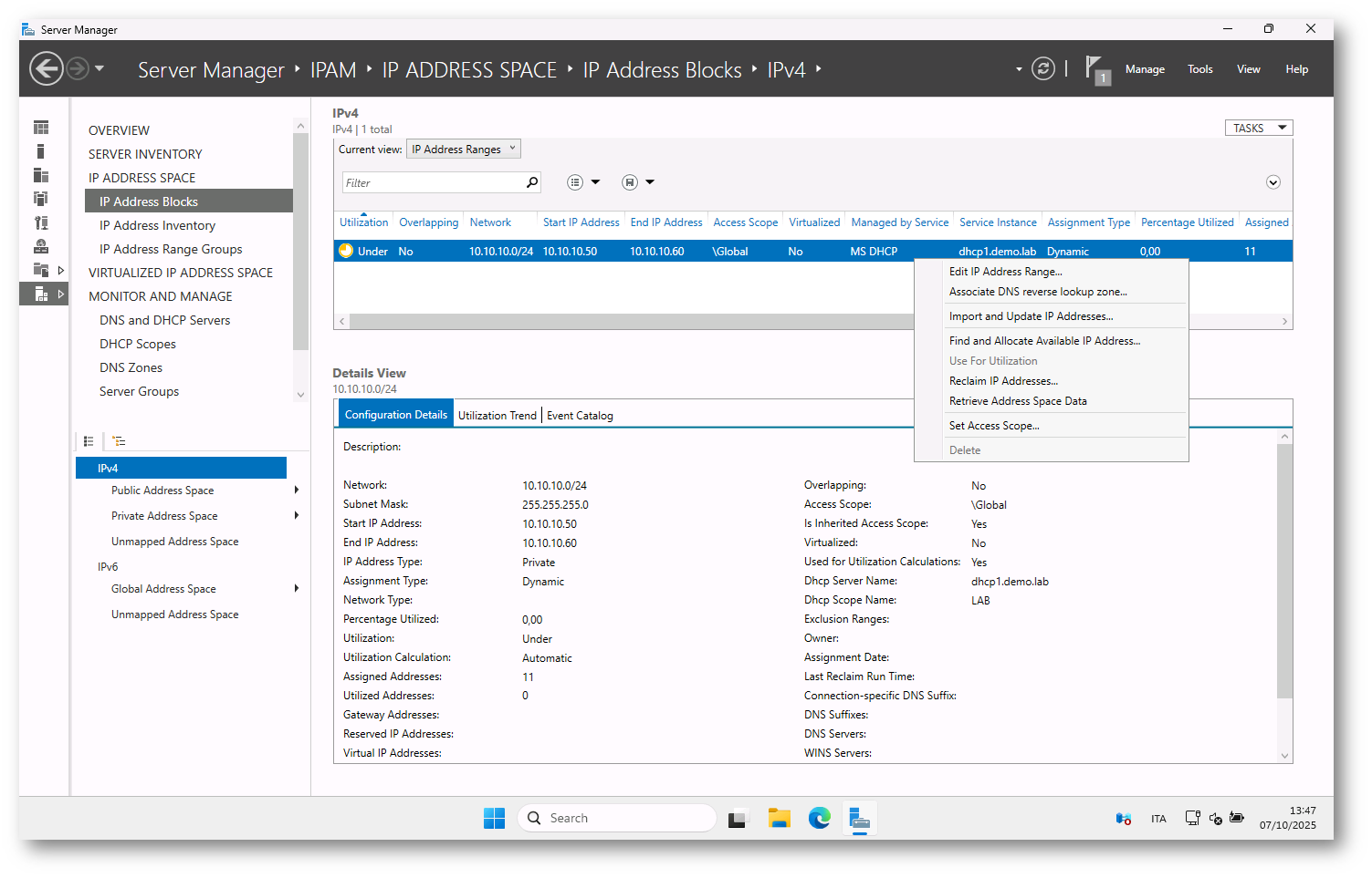Dopo aver completato la fase di configurazione e scoperta dei server, IPAM mette a disposizione una console centralizzata per la gestione e il monitoraggio dello spazio indirizzi IP. Attraverso questa interfaccia è possibile visualizzare in tempo reale l’utilizzo degli indirizzi, organizzare i blocchi e i range IP, nonché eseguire operazioni di amministrazione come l’importazione, l’aggiornamento o l’associazione con le zone DNS.