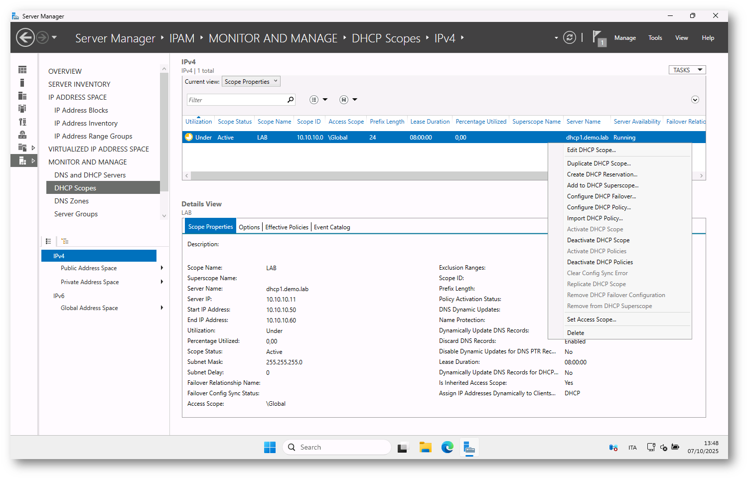 Dal menu contestuale è inoltre possibile eseguire varie operazioni amministrative, come la modifica o duplicazione di uno scope, la creazione di lease, la configurazione del failover o l’attivazione/disattivazione delle policy DHCP.