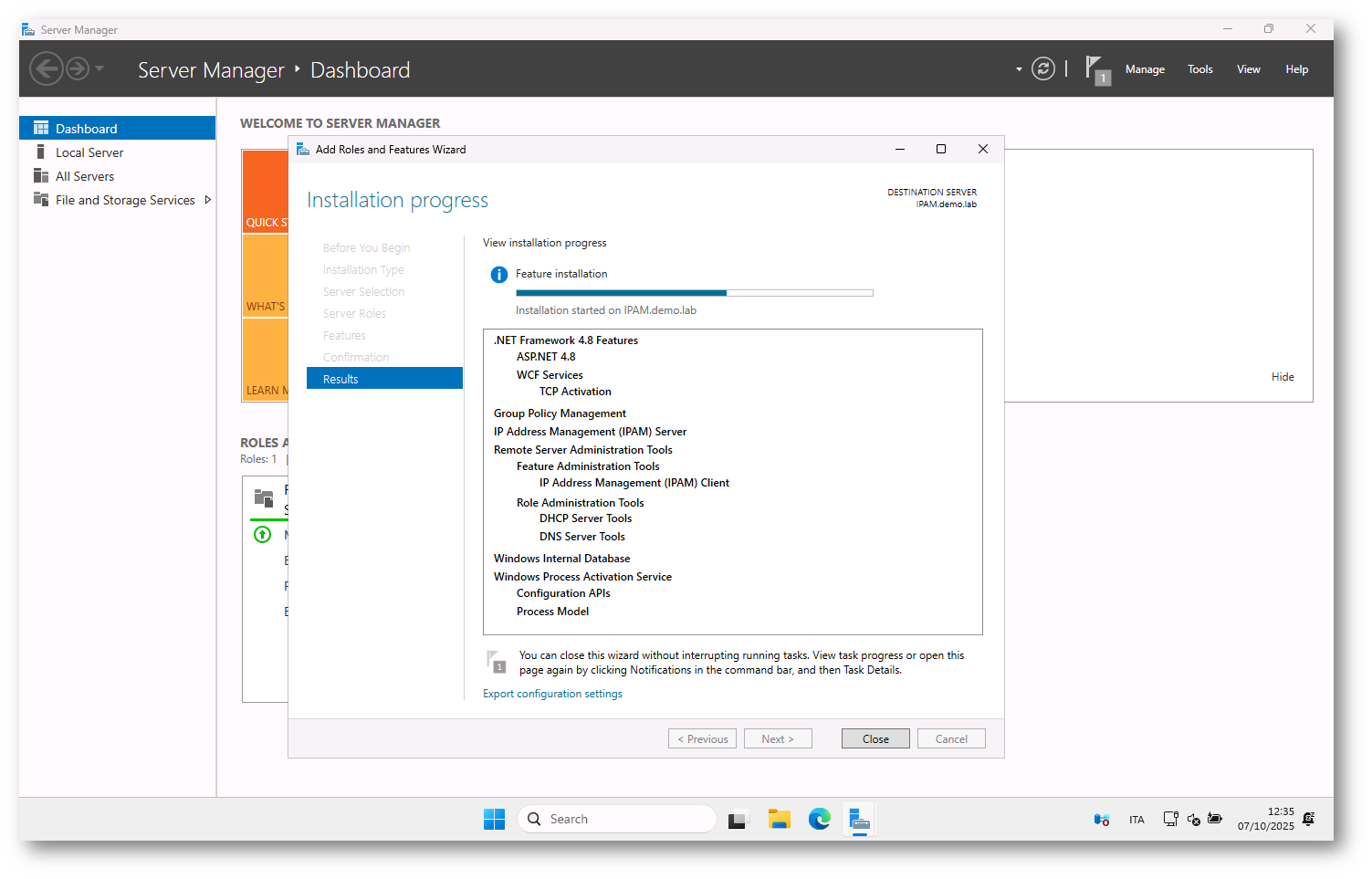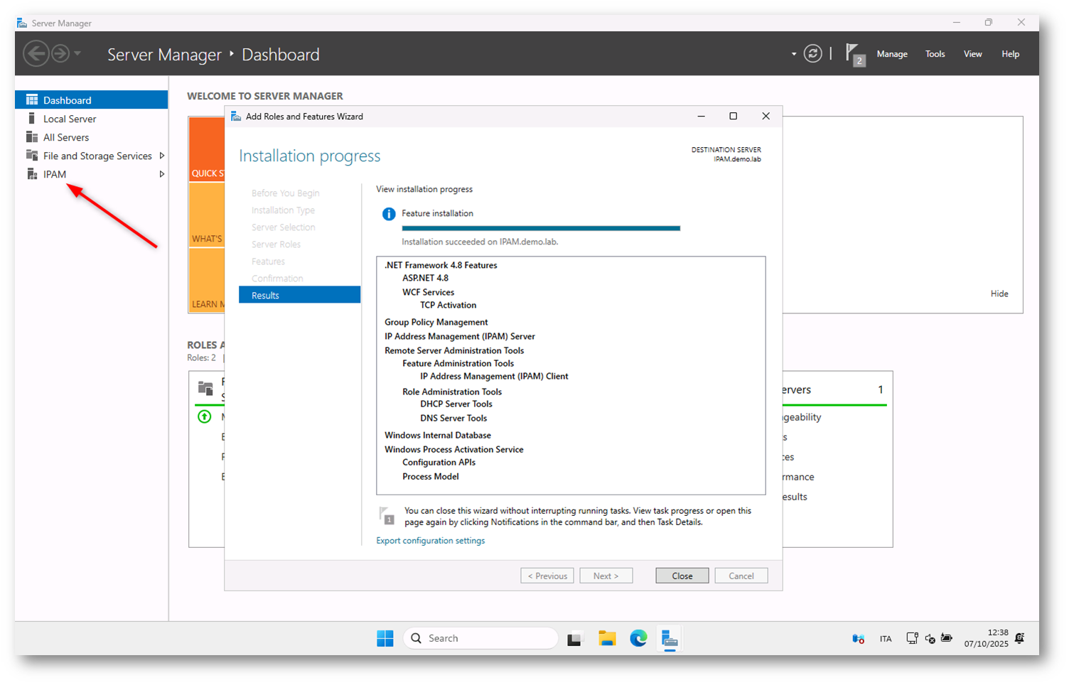 Figura 5: Installazione della funzionalità IP Address Management (IPAM) Server e dei prerequisiti completata