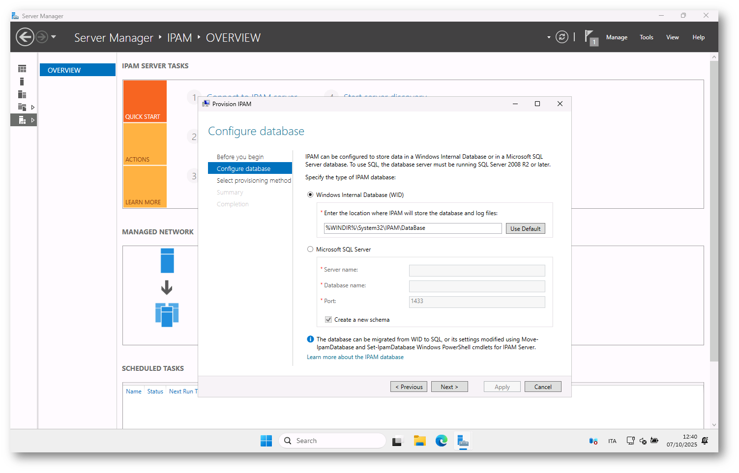 • Database: durante il provisioning potete scegliere Windows Internal Database (WID) o Microsoft SQL Server per l’archiviazione; WID resta l’opzione semplice, SQL è consigliato per HA/enterprise. (La scelta è nello “Provision IPAM wizard” ed è documentata da Microsoft per le versioni recenti; il flusso rimane valido anche su 2025).