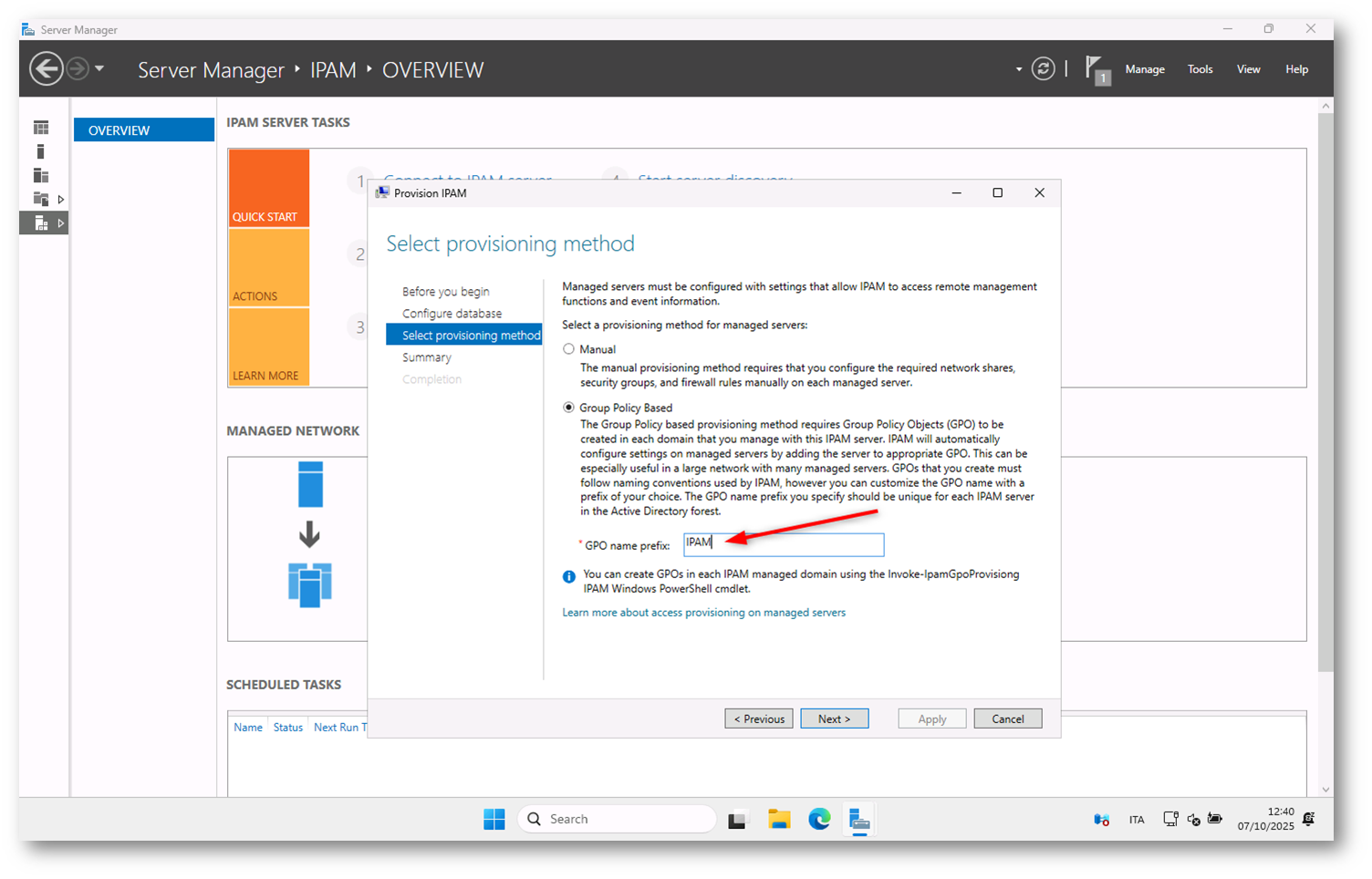 Nel testo del wizard trovate anche un importante avviso: Se scegliete la modalità GPO-based provisioning, non potrete passare in seguito alla modalità manuale tramite l’interfaccia grafica. Tuttavia, è possibile effettuare il cambio utilizzando il cmdlet PowerShell Set-IpamConfiguration.