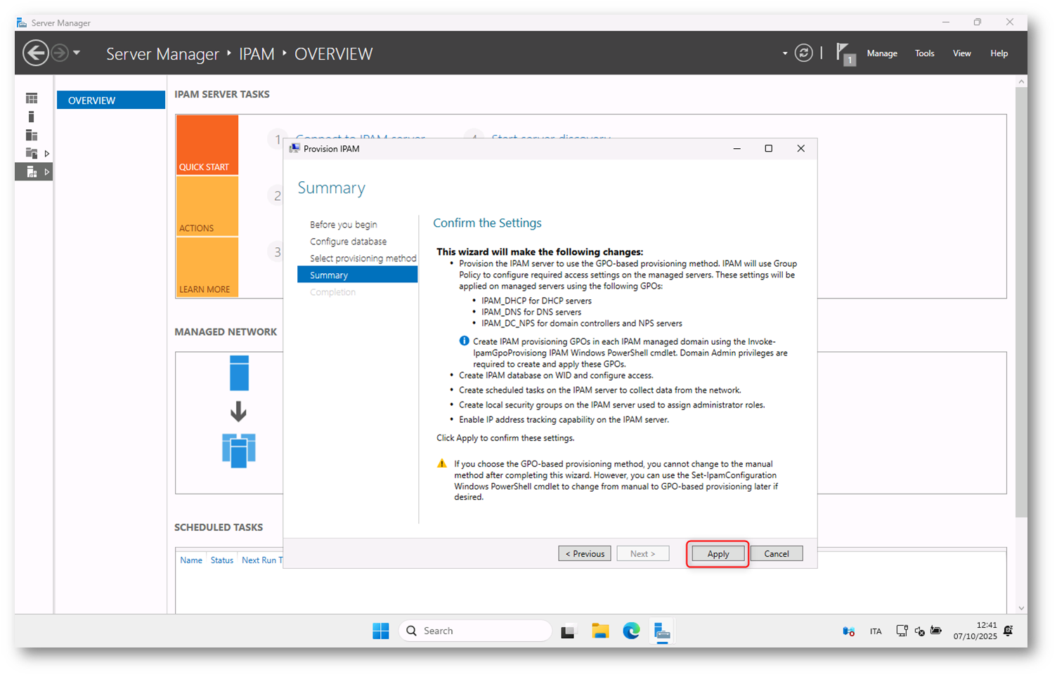 Nella schermata Summary del wizard di provisioning viene mostrato l’elenco completo delle operazioni che verranno eseguite. IPAM creerà i GPO di configurazione per DHCP, DNS e Domain Controller, imposterà il database scelto, configurerà le attività pianificate e abiliterà il tracciamento degli indirizzi IP. Dopo aver verificato le impostazioni, fate clic su Apply per completare il provisioning.